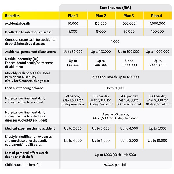 • Solid Plan: RM100,000 Death / RM5,000 Medical / Weekly Income Benefit.